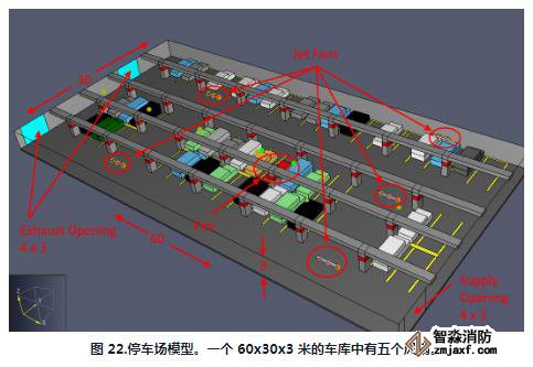 图 22显示了基本停车场尺寸和使用五个风扇的烟雾控制设计。四川消防检测设备