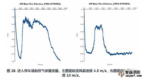 这种影响可以在图 29 中看到,即入口空气质量通量的绘图。在这里,我们展示了一个慢速和快速风扇案例。在这两种情况下,当火灾开始时,流入模型的新鲜空气会显着减少。随着热空气的排出,新鲜空气流量再次增加。