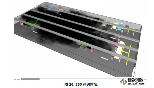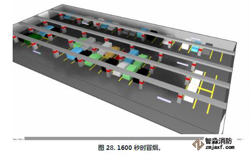 火开始于200 s,达到峰值300 s,停留在峰值到500 s,然后结束于600 s。在250 s,当聚氨酯 GM27 火灾仅达到其峰值的一半时,烟雾已经蔓延到停车场的大部分区域,如下图所示。 图 26确实表明,由喷射风扇产生的气流倾向于将烟雾推向出口。然而,500 s对于这两种情况,烟雾全部填满了停车场。