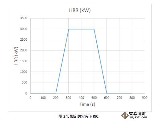在这个例子中,我们使用了一个很黑的火,代表聚氨酯 GM27 的燃烧。烟灰产量是0.198导致大量烟雾的原因。火的表面积为,每单位面积的峰值热释放速率为,给出的峰值热释放速率 (HRR) 为。3000 kW 值是根据 Jones 等人的论文选择的。使用简单的上升到峰值 HRR 和下降。选择这个时间历史是为了加速计算6 m2500 kW/m23000 kW