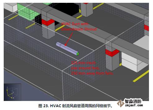 网格尺寸125 mm围绕风扇并250 mm远离风扇。包括梁、柱和汽车的简单模型。