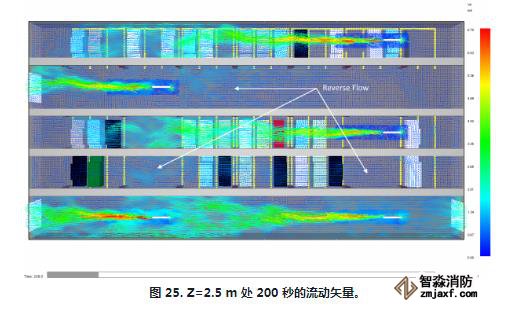 查看火灾开始前的初始流动模式。 图 25显示了快速风扇 ( 18 m/s) 情况下的相应流动矢量。在这两种情况下,主流都是朝向排气出口,但在风扇之间的通道中有一些反向流动。等高线显示在以 Z = 为中心的风扇正下方2.75 m(天花板位于 处3 m,梁的下边缘位于 Z = 处2.5 m)。找到没有反向流动的风扇配置并不简单,需要进行设计计算。